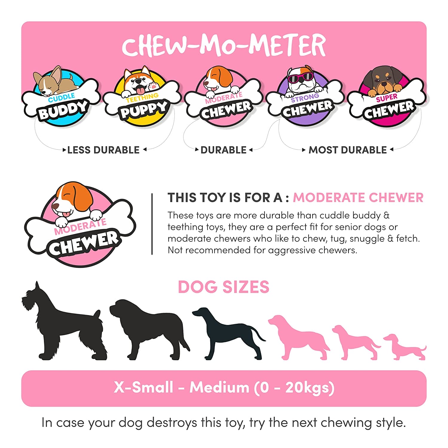 - For Moderate Chewers – These toys are more durable than cuddle buddy and teething toys, they are a perfect fit for senior dogs or moderate chewers who like to chew, tug, snuggle and fetch. Not recommended for aggressive chewers.