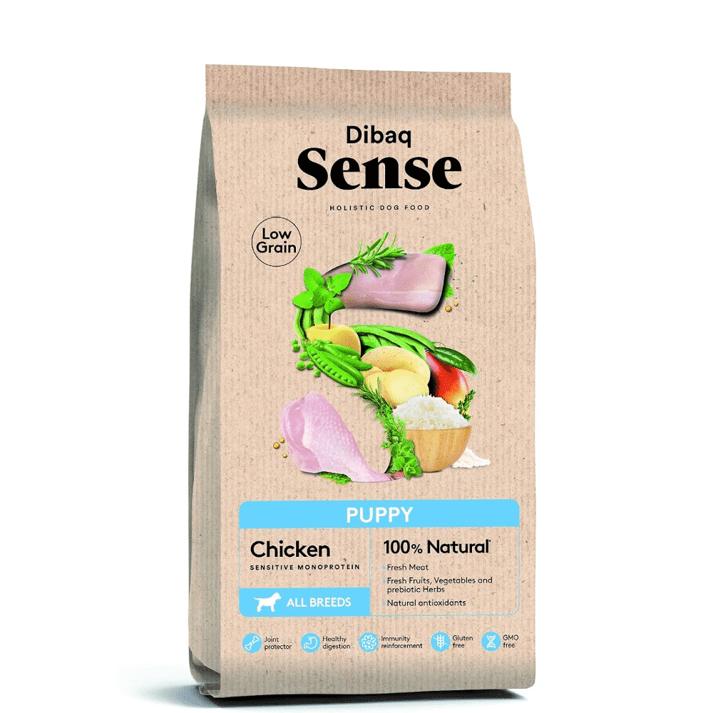 Dibaq Sense Puppy Chicken is a monoproteic hypoallergenic recipe made with fresh chicken meat, fresh fruits and vegetables (Guisants, green juices, potatoes, mango and apple) and rice. For dogs and mothers during pregnancy. It is a recipe without wheat, gluten, corn, soy and eggs. Dibaq Sense it is an exclusive hypoallergenic range with 100% Natural ingredients.