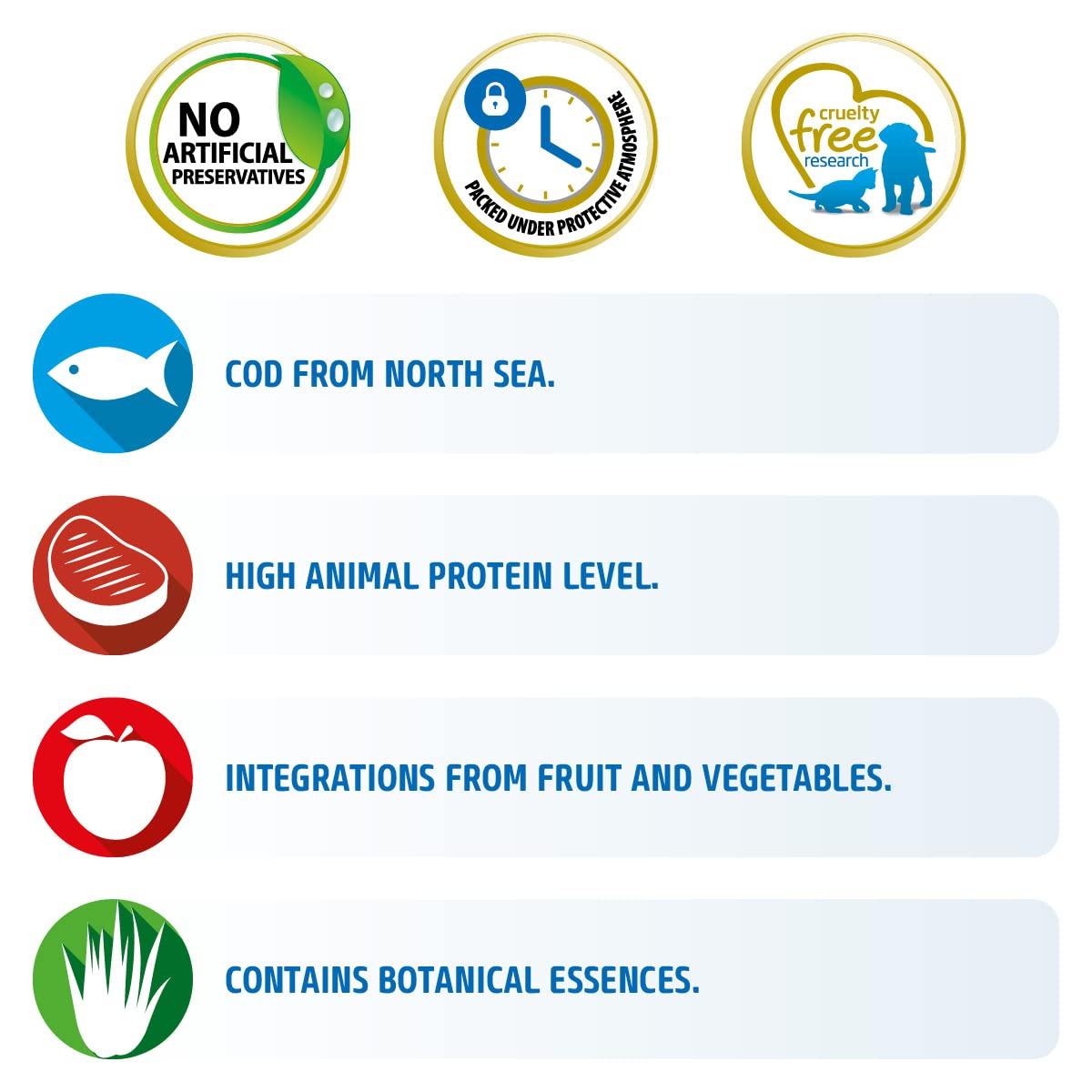 cod, dehydrated cod, sweet potatoes, herring oil, dehydrated herring, dried pumpkin, dehydrated shrimp (source of glucosamine hydrochloride and chondroitin sulfate), pea fiber, dried carrot, suncured alfalfa meal, inulin,