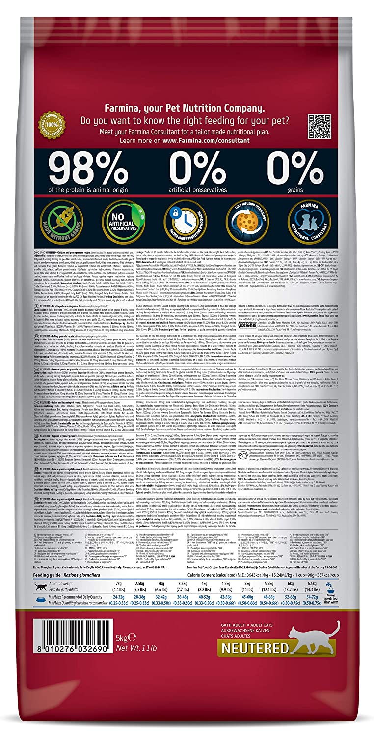 NUTRITION FOR CARNIVORES. N&D Prime Chicken & Pomegranate Feline Neutered (Indoor) is a complete and balanced diet for all life stages with 98% of the protein from animal source formulated to meet the nutritional levels for maintenance. Designed for specific maintenance needs of cats with decreased energy requirement, or prone to obesity, urinary problems and diabetes. Made with Non-GMO and human-grade fresh (never frozen) ingredients like free-range chicken, free-range eggs, sustainably sourced wild-caught herring, sweet potatoes and pomegranate. Low glycemic index, low-fat, high-fiber, grain-free and gluten-free recipe with no legumes, meals, by-products, hormones, antibiotics, or artificial preservatives. Made with natural antioxidants, prebiotics and integrated additional taurine. All formulations are scientifically-proven and clinically-tested thru certified cruelty-free research. Guaranteed over 90% digestibility. THE ONLY KIBBLE FILLED WITH COLD INJECTED LIFE ESSENTIALS (dehydrated fruits and vegetables, botanicals, vitamins, and minerals are vacuum-infused cold-pressed into the kibble after cooking). Nitrogen filled bags to prevent the food from oxidation. All packaging is recyclable and BPA-Free.