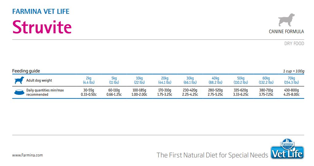 Farmina Vet Life Struvite Management dog food is highly palatable and specially composed to dissolve struvite stones and crystals in adult pets through low urinary concentration of magnesium and phosphorous and a low pH which will prevent the formation of struvite, increased sodium content which makes the pet drink and urinate more and high energy density deposition of struvite (magnesium ammonium phosphate) uroliths in the lower urinary tract.