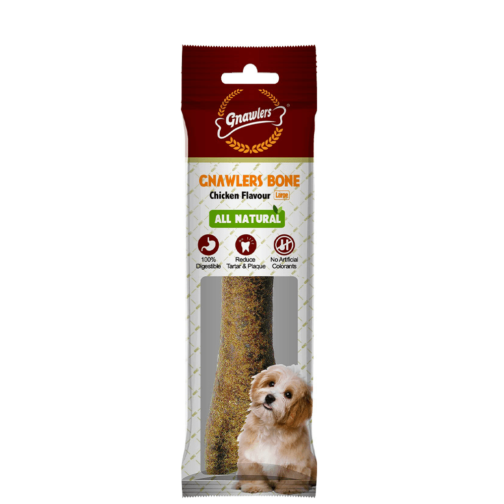 - Gnawlers bone in chicken flavour is a complementary feed for dogs.
