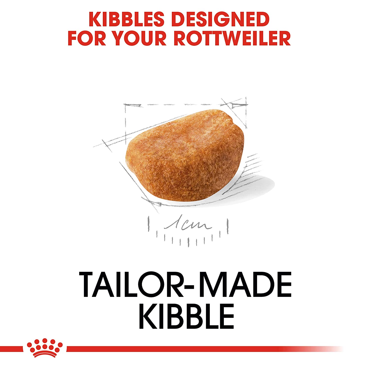 Exclusive kibble shape helps Rottweilers easily pick up and chew their food