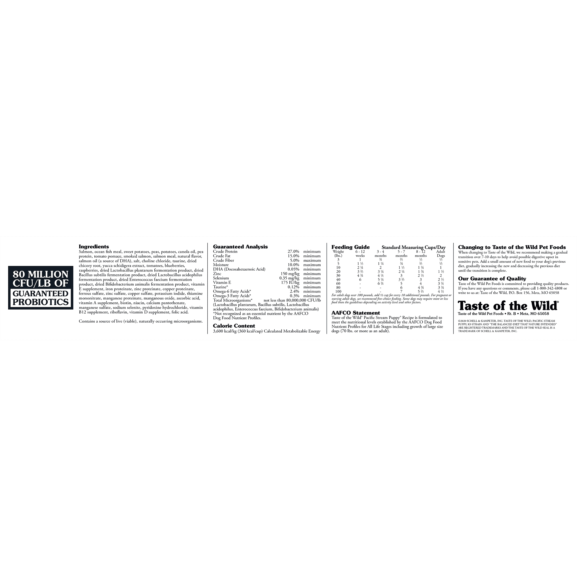 Species-Specific Probiotics – Healthy digestive and immune systems are vital to the overall health of your pet. Our proprietary K9 Strain Probiotics are developed specifically for dogs and added after the cooking process to ensure viability. Each pound of Taste of the Wild provides 80 million live, active cultures that help support healthy digestive and immune systems.